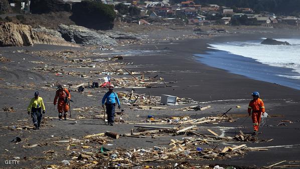 وقالت القوات البحرية في شيلي إن أول موجة تسونامي اصابت الساحل بعد 45 دقيقة من وقوع الزلزال. وأخلت السلطات جزءا من الساحل وصدرت تحذيرات من أمواج التسونامي لكل سواحل أمريكا الجنوبية والوسطى على المحيط الهادي.