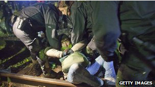 بي بي سي : اصطدمت الشرطة الالمانية مع الالاف من المحتجين المعارضين للنشاطات النووية الذين حاولوا اعتراض طريق قطار محمل بنفايات نووية من مركز معالجة فرنسي الى منشأة خزن مؤقتة في دانينبرغ شمالي المانيا. وقالت الشرطة إنها أخلت المكان من المحتجين الذين قام العديد منهم بمد اجسادهم على السكة الحديد التي يمر عليها القطار لمنع مروره.