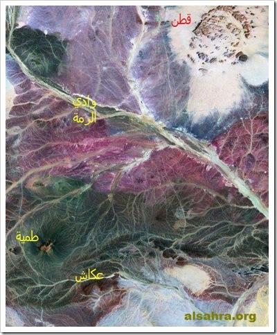 ويقول العبودي : والجدير بالذكر أنه يريد ببطن الرمة ما كان فوق عقلة الصقور، حيث أن طريق حاج الكوفة يدع قطنا جنوبا، والذي يمر بالقصيم هو طريق حاج البصرة. وهذا لا يمر بوادي الرمة بعد القصيم بل يتياسر من القريتين قرب عنيزة.