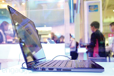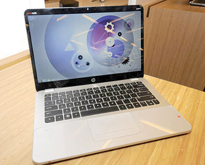 خدمة «إنفي سبيكتر» من «إتش بي». تنطبق أوصاف الدفاتر النحيفة تماما على «إنفي سبيكتر» Envy Spectre من «إتش بي»، لكنه عالي السعر بحدود 1400 دولار لدى طرحه للبيع الشهر المقبل في الولايات المتحدة. وهو يتميز بهيكل زجاجي مقاوم للخدش من نوع «غوريلا غلاس» بشاشة 1600×900 «راديانس ديسبلاي» قياس 14 بوصة موضوعة على إطار قياس 13.3 بوصة. وإذا كنت معجبا بشكل «آي فون 4» و«4 إس» فستعجب بـ«سبيكتر»، فالجانب العلوي منه مسطح تماما، مع زوايا مستديرة، وهو يملك مميزات صوتية عالية، وتقنية «كول سينس» للإبقاء على أجزائه باردة، مع شريحة «إن إف سي» حيث يستند الكف، بغية التشارك بعناوين مواقع الإنترنت URL عن طريق متصفح الهاتف الذكي، وله أيضا فتحات متعددة، بما فيها واحدة للـ«إثرنيت»، مع معالج «كور آي 5»، وذاكرة عشوائية «رام» سعة 4 أو 8 غيغابايت، مع بطاقة «إس إس دي» سعة 128، أو 256 غيغابايت. وتعمل البطارية لمدة تسع ساعات. وتبلغ نحافته 0.79، ووزنه 3.79 رطل، أي أنه ثقيل نسبيا.