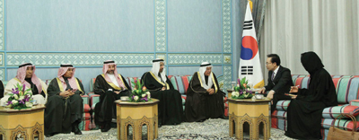 الرئيس الكوري الجنوبي لي ميونج باك يتحدث مع المهندس علي النعيمي وزير البترول والثروة المعدنية، وعلى يمينه المهندس خالد الفالح الرئيس التنفيذي لشركة أرامكو السعودية. واس