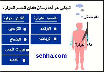 الجسم يفقد الحرارة بعدة طرق, فحوالي 55–65% من حرارة الجسم تفقد بالإشعاع radiation, وفي وجود الجفاف يفقد 2–3% من حرارة الجسم عن طريق التوصيل conduction, ولكن عندما يغمر الجسم في الماء البارد فإن فقدان الحرارة بالتوصيل يصل إلى 50%, وفقدان الجسم للحرارة عن طريق تيارات الحمل convection يمثل 10% بينما 2–9% من حرارة الجسم يفقد لتدفئة الهواء المستنشق, ونحو 20–27% يفقد عن طريق التبخر من الجلد والرئتين, والأطفال تنخفض حرارة أجسامهم أسرع من الكبار بسبب كبر مساحة سطح الجسم بالنسبة لكتلة الجسم.