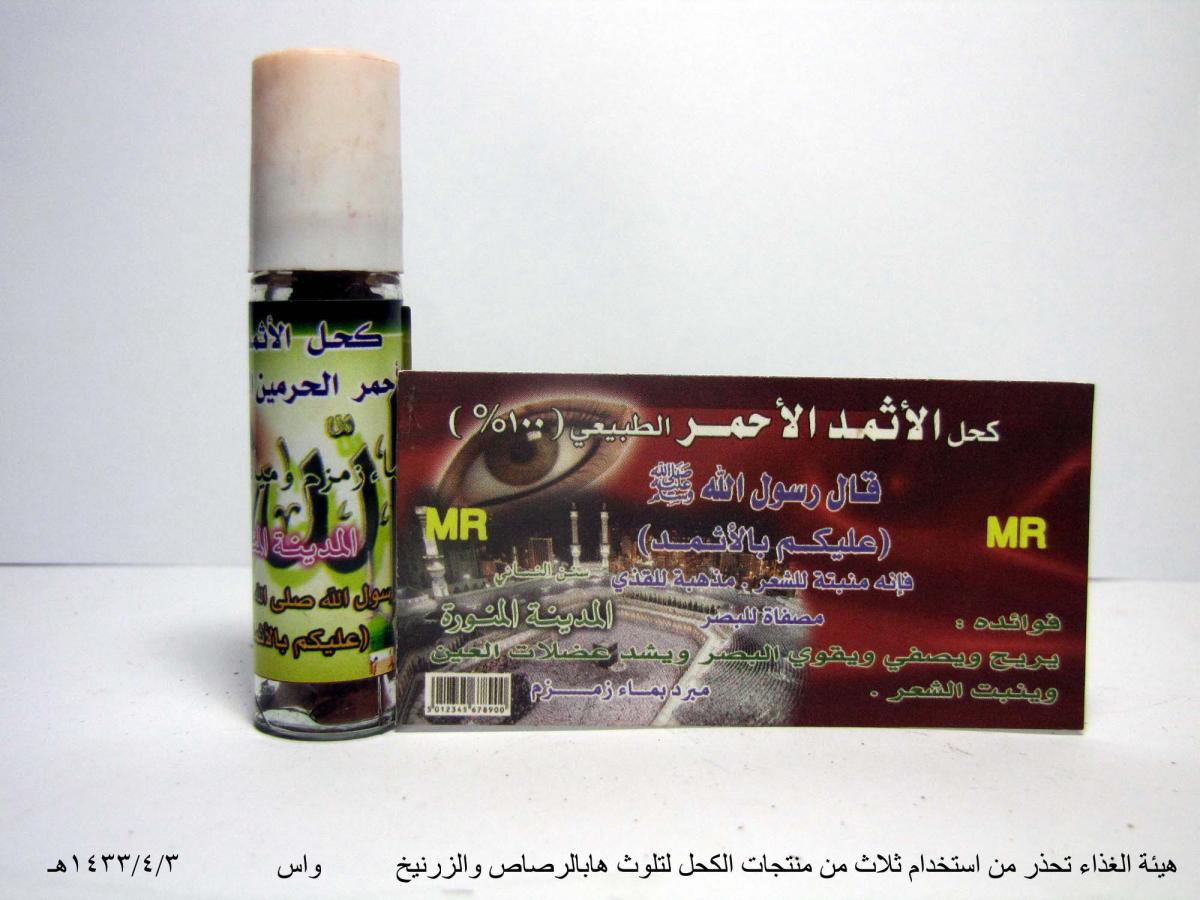 قامت الهيئة العامة للغذاء والدواء بتحليل عدد من العينات لمنتجات الكحل المسوقة محلياً حيث بلغ عدد ما تم تحليله 46 نوعا من الكحل وذلك للتأكد من خلوها من المعادن السامة والثقيلة والتلوث البكتيري. وثبت بعد التحليل تلوث ثلاث منتجات بكمية عالية من معدن الرصاص مخالفة لما هو منصوص عليه في المواصفة القياسية الخليجية لمنتجات التجميل رقم (GSO1943/2009) وتحمل أسماء كحل الأثمد الأحمر وكحل الأثمد الأسود الطبيعي وكحل الأثمد الأسود الأصلي، كما ثبت احتواء أحد هذه المنتجات وهو كحل الأثمد الأسود الطبيعي بماء الزمزم ومياه الورد على نسبه عالية من معدن الزرنيخ مخالفة لما هو منصوص عليه في المواصفة القياسية الخليجية لمنتجات التجميل رقم(GSO1943/2009).