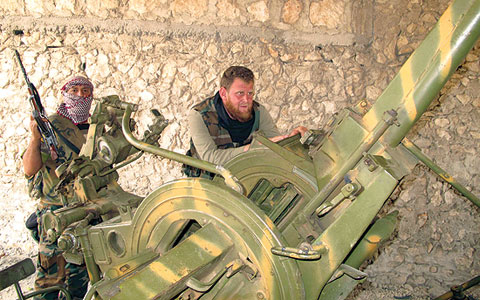 عنصران من الجيش السوري الحر يعاينان أسلحة استولت عليها المعارضة في موقع عسكري بالقرب من حلب