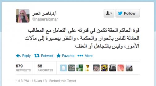 - أيضا في وقت نشاط الهاشتاق، يوجه رسالة قوية الشيخ ناصر العمر عبر ثلاث تغريدات مخاطباً الدولة ومتّبعاً فيها هذا التسلسل: