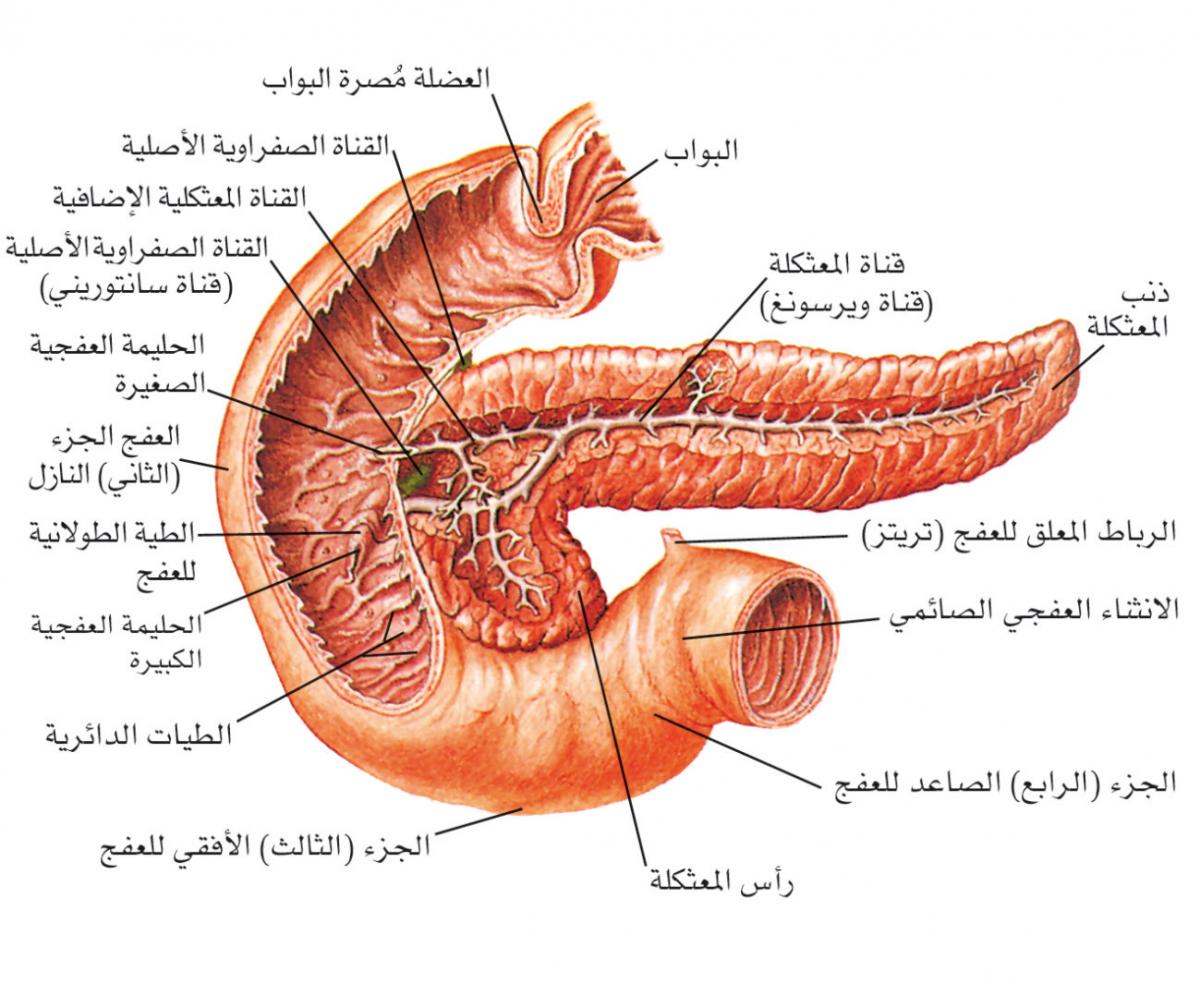 و يتكون البنكرياس من رأس ورقبة، جسم، ذيل وكل البنكرياس يقع خلف الغشاء البريتوني عدا الجزء الأخير من الذيل فإنه بين الكلية والطحال.