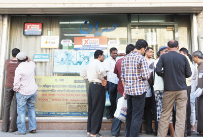 وافدون يقفون أمام محل للصرافة في الدمام أمس. تصوير: عيسى الدبيسي