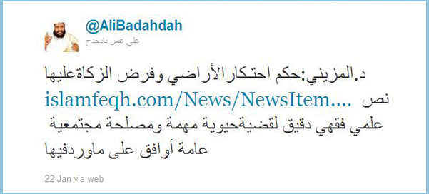 ويتفق الناشط في الفكر الإسلامي عضو تدريس بجامعة الملك عبدالعزيز بجدة الدكتور علي بادحدح مع آراء المزيني، وكتب تغريدة على "تويتر" يؤيده فيها.. كما يؤكد لـ"العربية.نت" أن ارتفاع أسعار الأرضي بسبب الاحتكار ألحق ضرراً كبيراً بالناس.