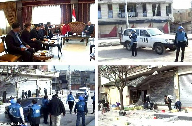 ونقل التلفزيون السوري لقطات اليوم الخميس لعاملين تابعين للأمم المتحدة يرتدون سترات زرقاء واقية من الرصاص وخوذات ويلتقطون صورا للحطام المحيط بهم وقال مقدم البرنامج أنهم من فريق آموس أثناء زيارتها لبابا عمرو. وكانت سوريا قد رفضت في بادئ الأمر السماح لآموس بدخول البلاد لكنها أذعنت بعد أن شارك حليفاها روسيا والصين بقية أعضاء مجلس الأمن التابع للأمم المتحدة في توبيخها. والتقت آموس مع وزير الخارجية السوري وليد المعلم أمس الأربعاء وقال مساعد له أنه أبلغها أن بامكانها الذهاب إلى أي مكان تريد الذهاب إليه في سوريا. وتسعى آموس لتأمين دخول منظمات الإغاثة التي منعت من دخول مناطق القتال العنيف.