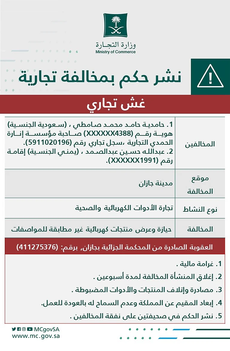 ونشرت الوزارة الحكم القضائي الصادر من المحكمة الجزائية بجازان متضمناً غرامة مالية وإغلاق المنشأة المخالفة لمدة أسبوعين، ومصادرة وإتلاف المنتجات والأدوات المضبوطة، وإبعاد المقيم عن المملكة وعدم السماح له بالعودة للعمل، والتشهير عبر نشر الحكم في صحيفتين على نفقة المخالفين.