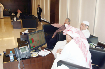 متداولون يتابعون سوق الأسهم في صالة للتداول في جدة