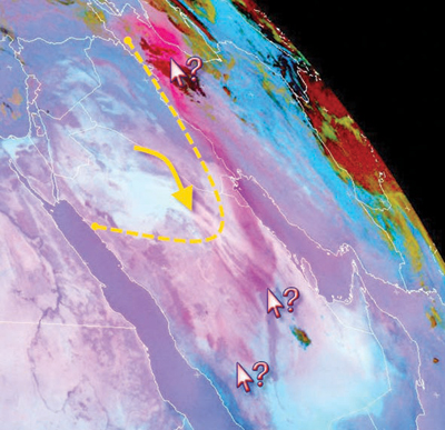 صورة من قمر متيوسات تحت الأشعة الحمراء تظهر انتشار الغبار على بعض مناطق السعودية يوم أمس ويتضح ذلك من خلال اللون الزهري الفاتح.