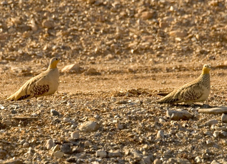 طيور القطا المنقط : وصف الطائر : قطا رشيق و شاحب اللون بذيل طويل مدبب ، يتميز هذا النوع عن الأنواع الأخرى بأن ريش الذيل متطاول وعدم وجود فاصل بين لون الصدر والبطن ، يوجد خطوط مستطيلة في منطقة البطن تتضح أكثر عند الطيران والحلق وجانبي الرأس برتقالي مصفر تكون فاتحة في الإناث وغامقة بالذكر ، الحلقة حول العين صفراء ، تكون باهتة في الأنثى والمنقار يميل للأزرق الفاتح ، هناك نقاط قاتمة بالصدر والرقبة بالأنثى أما الذكر فهي رمادية فاتحة .