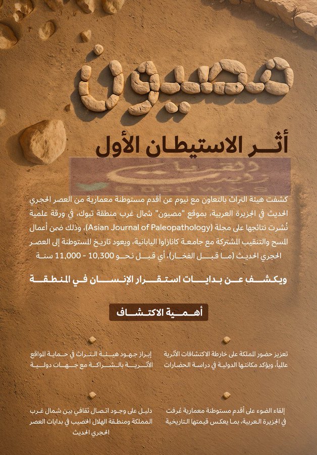 الرياض (واس) أعلن صاحب السمو الأمير بدر بن عبد الله بن فرحان وزير الثقافة رئيس مجلس إدارة هيئة التراث، عن اكتشاف أقدم مستوطنة معمارية في الجزيرة العربية، وذلك ضمن أعمال التنقيب الأثري التي تنفذها الهيئة بالشراكة مع جامعة "كانازاوا" اليابانية، وبالتعاون مع نيوم في موقع "مصيون" شمال غرب مدينة تبوك، ويعود تاريخ المستوطنة إلى العصر الحجري الحديث ما قبل الفخار، وتحديدًا إلى الفترة بين 11000 و10300 سنة من الوقت الحاضر.