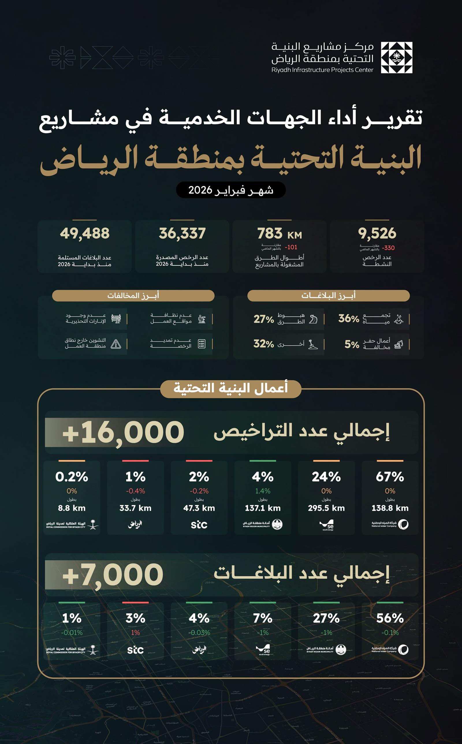 وفيما يتعلق بالبلاغات، سجّل التقرير 49,488 بلاغًا منذ بداية العام، منها 7,000 بلاغ جديد خلال شهر فبراير، حيث تصدّرت بلاغات تجمعات المياه القائمة بنسبة 36%، تلتها بلاغات الهبوطات بنسبة 27%، ثم البلاغات الأخرى بنسبة 32%، وبلاغات الحفر المخالف بنسبة 5%.