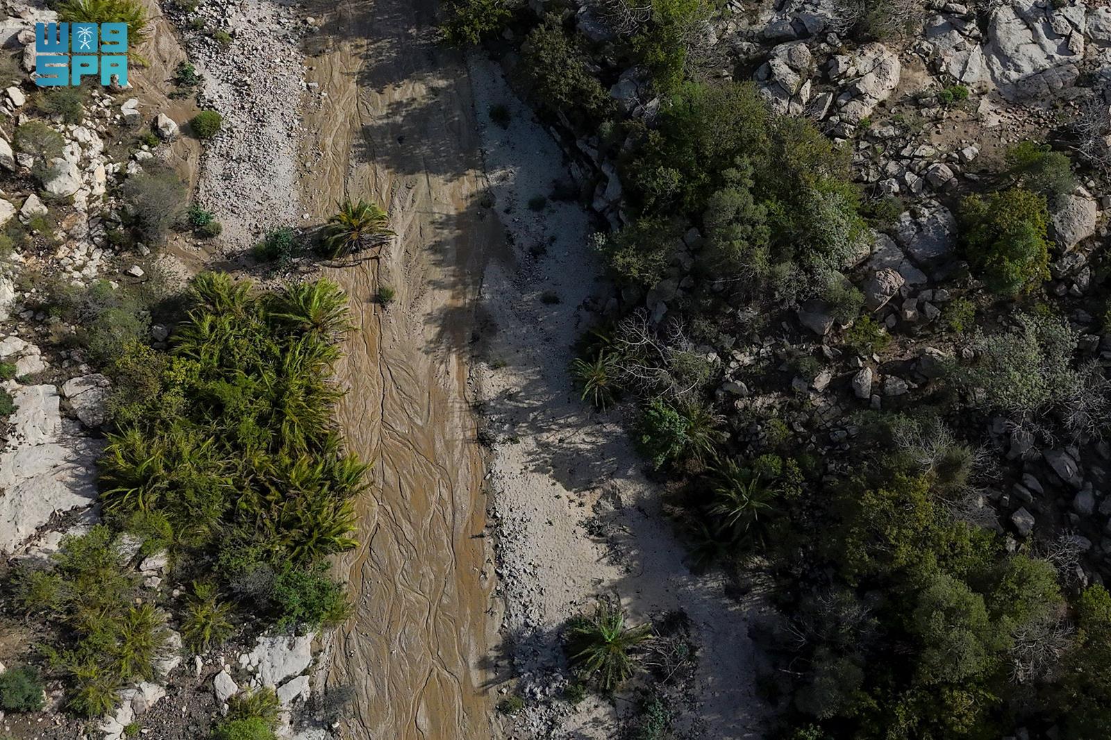 ويمتد الوادي بين جبال شاهقة تحتضنه من الجانبين، في مشهد بانورامي يبرز تدرجات الصخور وتكويناتها الطبيعية، بينما يشق الوادي طريقه بانسيابية عبر المنحدرات، متجهًا نحو وادي السدين وصيادة ورخمات وبوا، في مسار مائي يعكس حيوية المكان وتشكّله عبر الزمن.