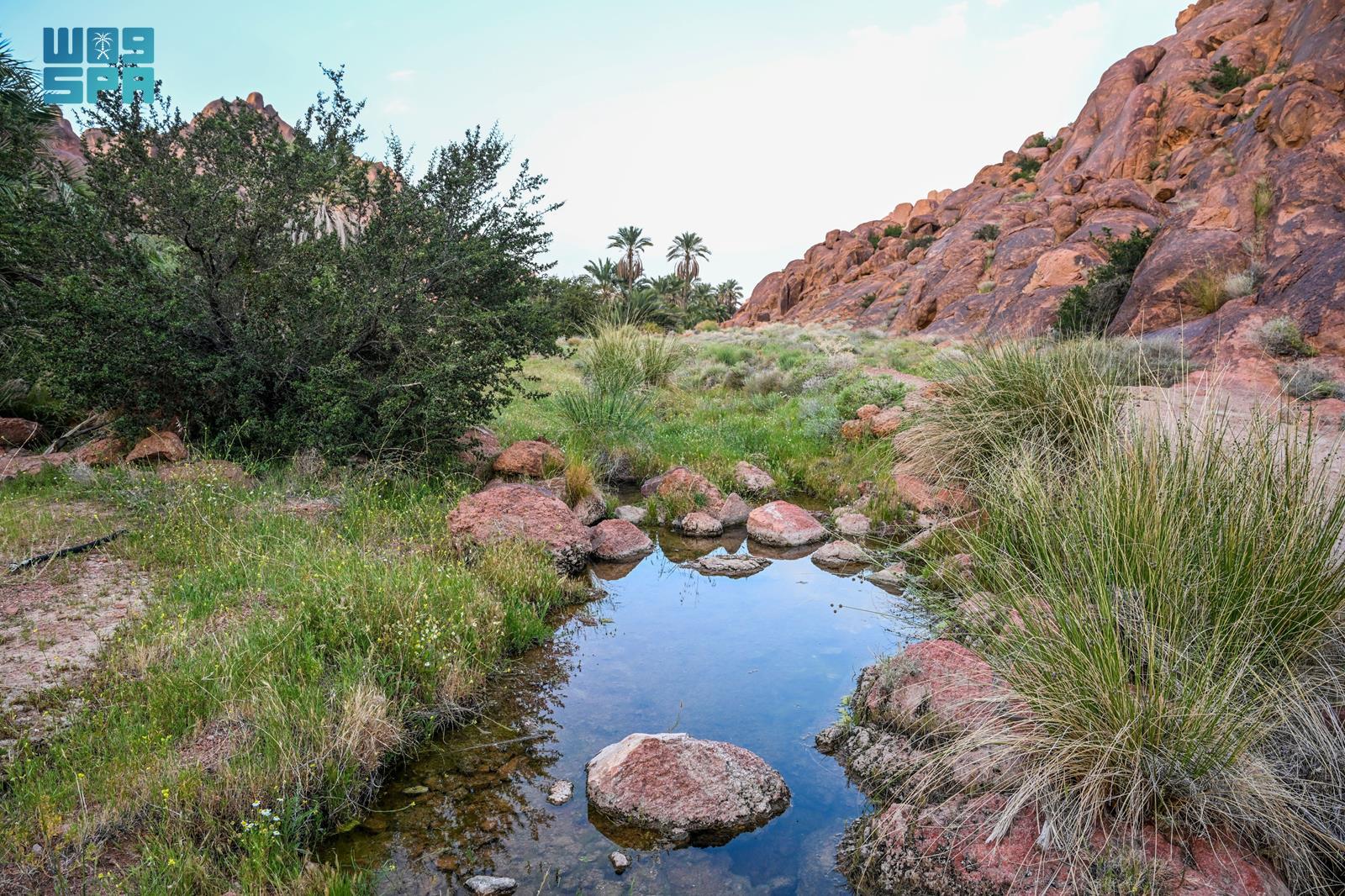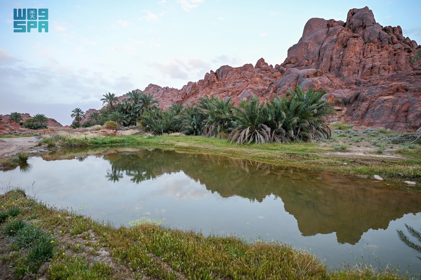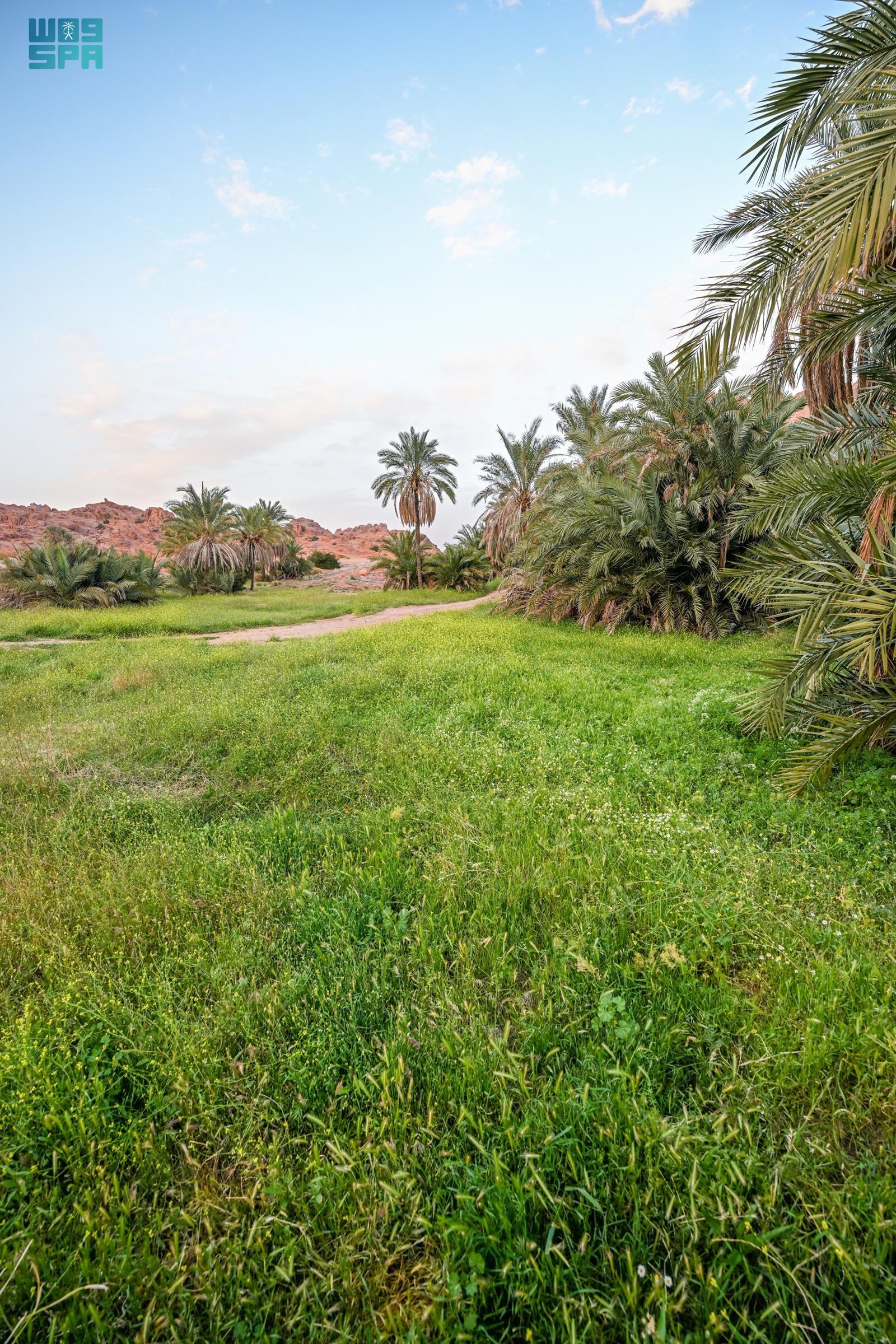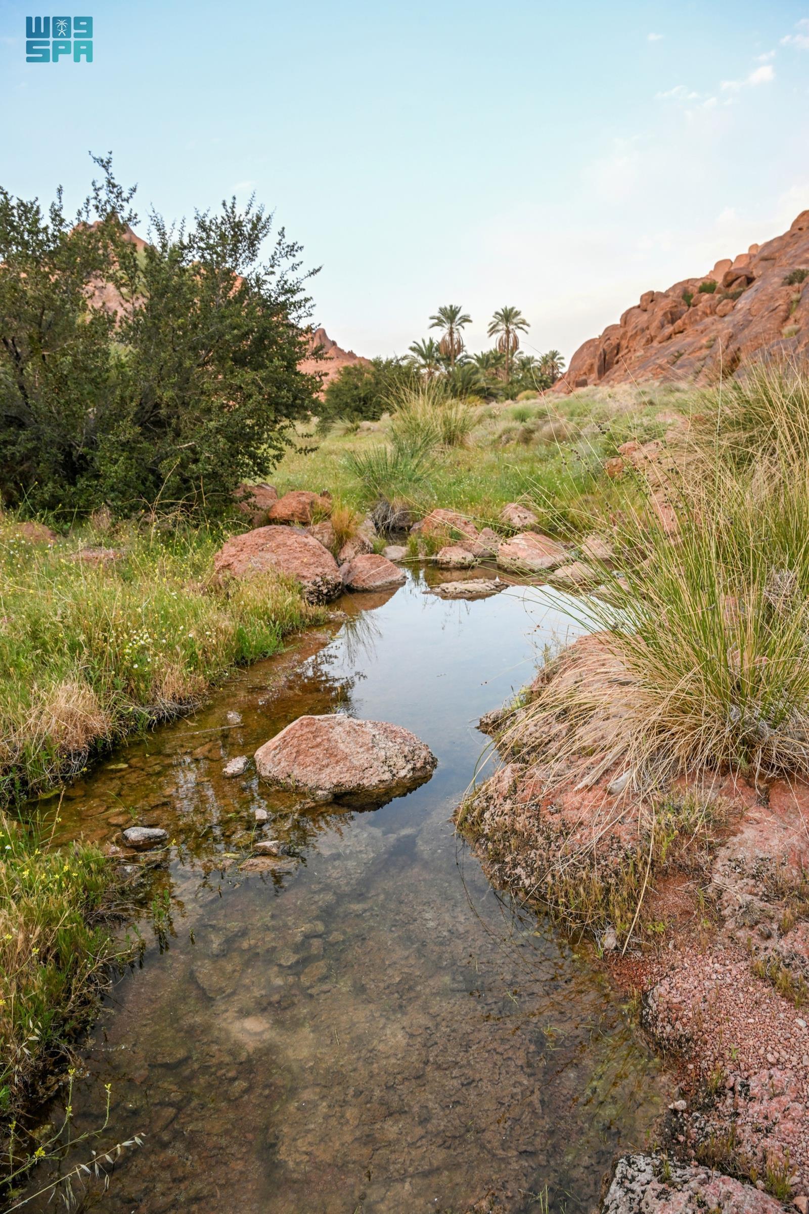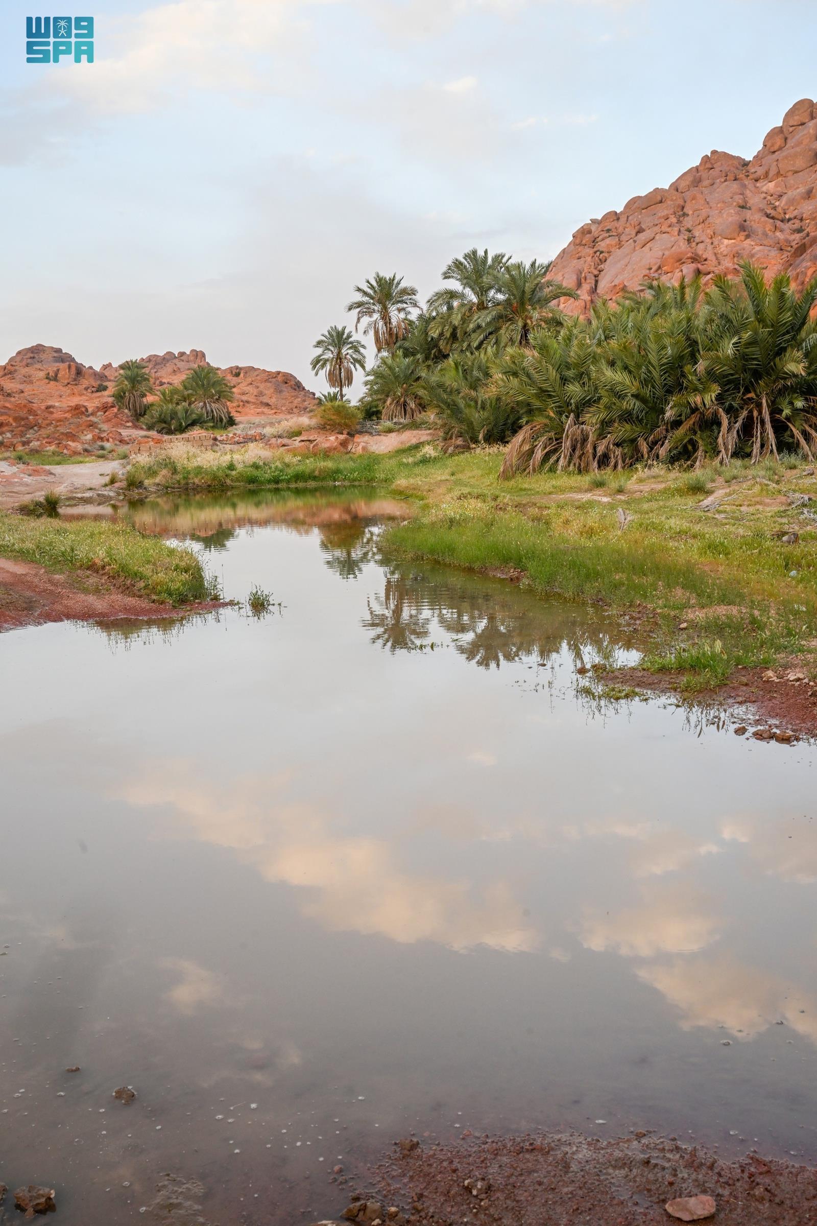 وشكلت الأمطار واحات طبيعية وبرك مائية بين ثنايا الجبال، تحيط بها أشجار النخيل والنباتات المحلية، ما أضفى جمالًا إضافيًا على المكان، وعكس صورة بيئية متكاملة تجمع الماء والخضرة والتضاريس الجبلية.