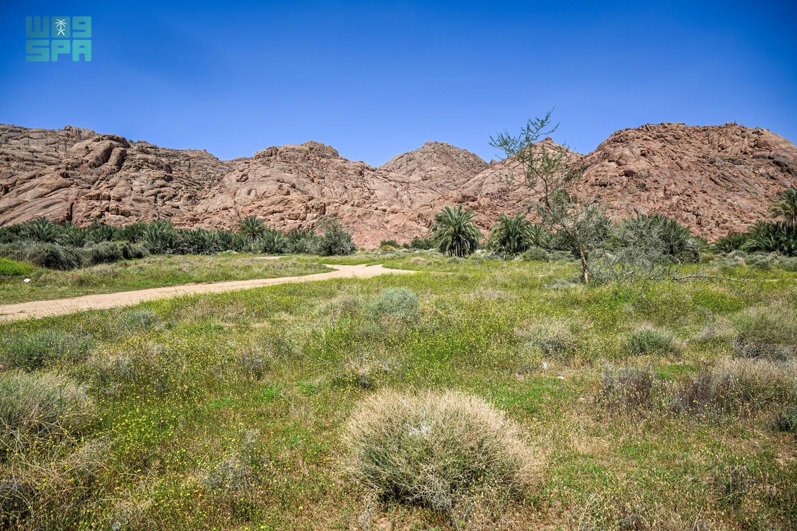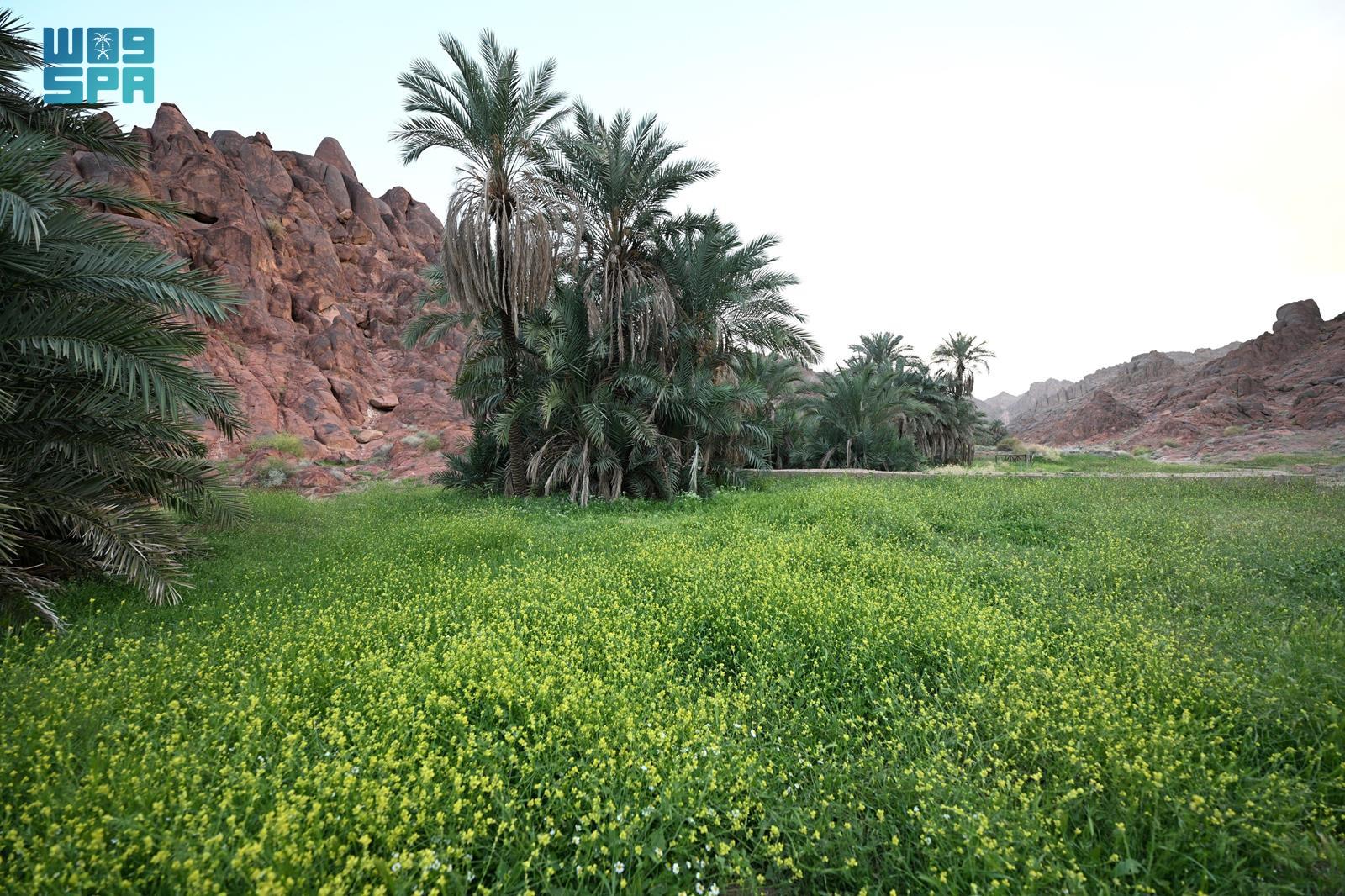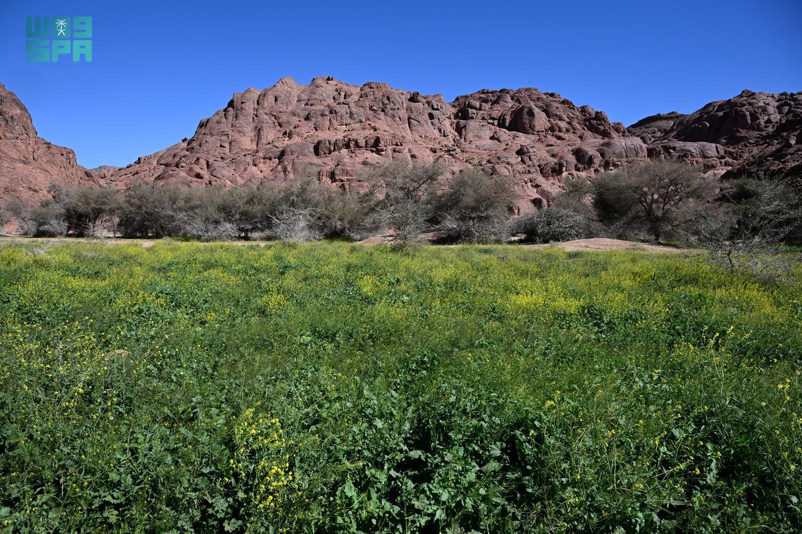 ورُصد امتداد الغطاء النباتي في الشعاب والأودية، حيث انتشرت الأعشاب الموسمية والنباتات البرية، مشكلةً لوحات بصرية متناسقة مع التكوينات الصخرية المميزة للجبال، فيما أسهمت مياه الأمطار في تغذية التربة وتعزيز نمو الغطاء النباتي في مواقع متعددة.