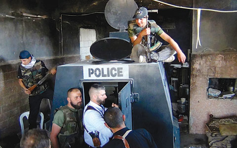 عناصر من الجيش الحر على متن مدرعة للشرطة استولوا عليها في الاتارب قرب حلب - رويترز