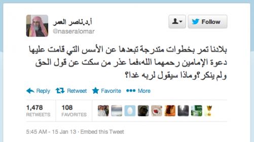 - أيضا في وقت نشاط الهاشتاق، يوجه رسالة قوية الشيخ ناصر العمر عبر ثلاث تغريدات مخاطباً الدولة ومتّبعاً فيها هذا التسلسل: