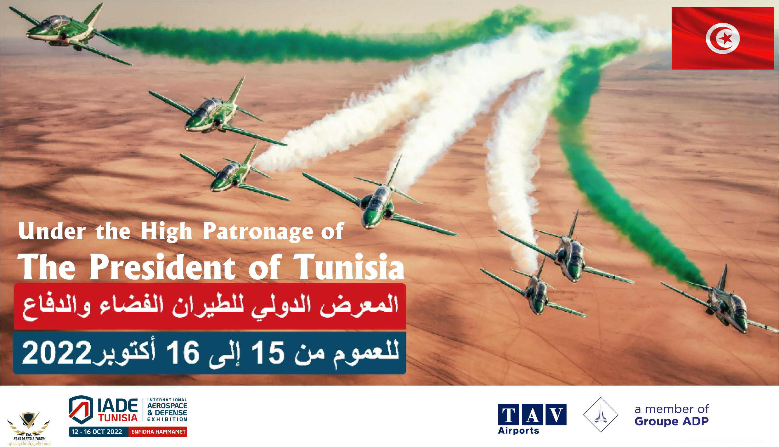تونس (واس) بدأت بمطار النفيضة الحمامات الدولي التونسي اليوم فعاليات الدورة الثانية من المعرض الدولي لصناعة الطيران والدفاع IADE تونس 2022، وذلك تحت رعاية الرئيس التونسي قيس سعيد وبمشاركة وزارة الدفاع والداخلية والنقل والسياحة والخارجية والصناعة والتجارة وديوان الطيران المدني والمطارات والإدارة العامة للطيران المدني.