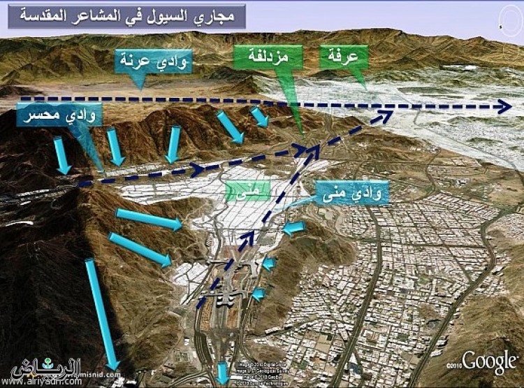 ملاحظة: وادي عرنةيفصل مشعر عرفات عن بقية المشاعر، أولاها بطن المغمس غرباً، وعليه مسجد نمرة، مجمعه معه وادي نعمان يجعله خطر العبور وقت السيول.