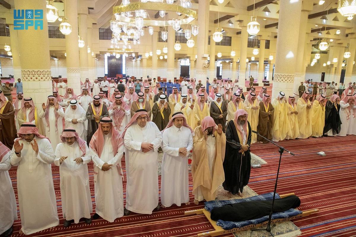 وأدّى الصلاة مع سموه، صاحب السمو الأمير تركي بن عبد الله بن عبد الرحمن، وصاحب السمو الملكي الأمير سعود بن سعد بن عبد العزيز، وصاحب السمو الأمير فيصل بن عبد الله بن محمد، وصاحب السمو الملكي الأمير متعب بن عبد الله بن عبد العزيز، وصاحب السمو الأمير عبد الرحمن بن سعود الكبير، وصاحب السمو الملكي الأمير فيصل بن خالد بن عبد العزيز مستشار خادم الحرمين الشريفين، وصاحب السمو الأمير سعود بن سلمان بن محمد، وصاحب السمو الأمير د. تركي بن سعود بن محمد، وصاحب السمو الأمير بندر بن سعد بن خالد، وصاحب السمو الأمير سلطان بن سعد بن خالد سفير خادم الحرمين الشريفين لدى الكويت، وصاحب السمو الملكي الأمير سلمان بن خالد بن سلطان بن عبد العزيز، وصاحب السمو الأمير عبد الرحمن بن محمد بن عبد العزيز بن عياف نائب وزير الدفاع، وصاحب السمو الأمير مشعل بن متعب بن ثنيان.