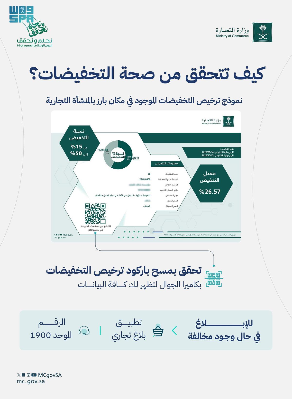 الرياض (واس) أوضحت وزارة التجارة أنه بإمكان المستهلك التحقق من نظامية وصحة التخفيضات والعروض التجارية من خلال مسح "باركود (الترميز الرقمي)" الظاهر في ترخيص التخفيضات، بمصورة الجوال لتظهر له جميع البيانات المتعلقة بالتخفيضات التي تشمل: