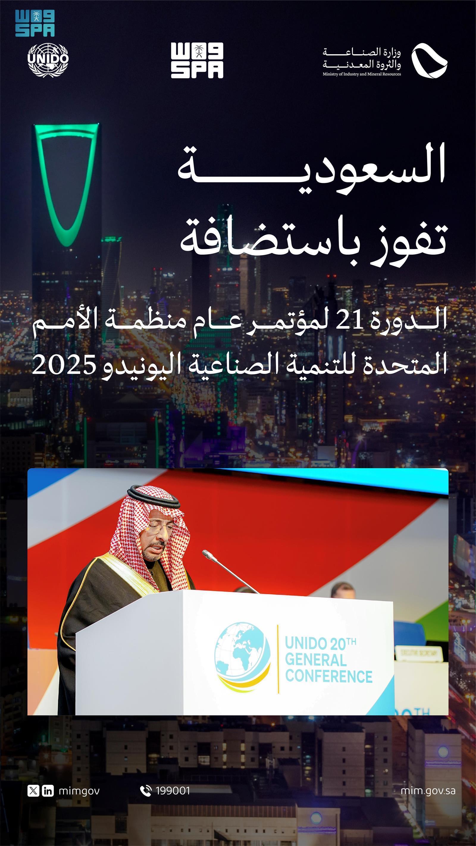 الرياض (واس) فازت المملكة العربية السعودية باستضافة الدورة الحادية والعشرين لمؤتمر عام منظمة الأمم المتحدة للتنمية الصناعية (يونيدو)، التي ستعقد في الرياض خلال شهر نوفمبر 2025، وذلك بعد اعتماد قرار بإجماع الدول الأعضاء في المنظمة البالغ عددها 172 دولة.