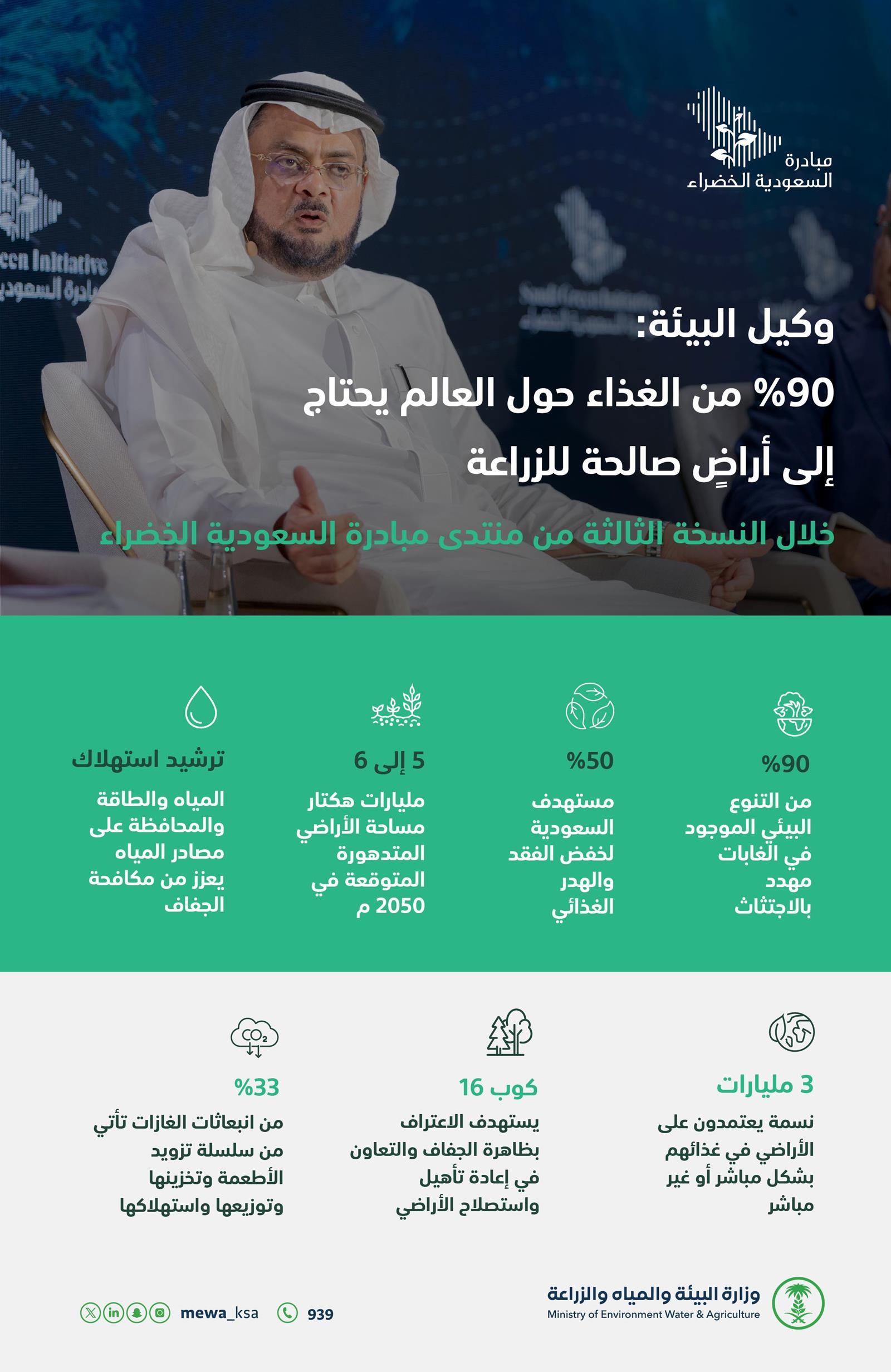 وأشار إلى أن 33% من انبعاثات الغازات تأتي من سلسلة تزويد الأطعمة (التخزين والتوزيع والاستهلاك)، حيث تستهدف السعودية خفض الفقد والهدر في الغذاء بنسبة 50%، إضافة إلى رفع كفاءة الطاقة المتجددة، وزيادة الوعي لترشيد استهلاك الطاقة والمياه، لافتًا إلى أن ترشيد استهلاك المياه والمحافظة على مصادرها يعزز من مكافحة الجفاف والتصحر وتنمية الأراضي، وهي من العوامل الأساسية المؤثرة على الامن الغذائي محليًا ودولياً، داعياً إلى تشجيع مشاركة القطاع الخاص بالتمويل من أجل خلق نماذج مستدامة اقتصادياً ومالياً وترجمتها إلى مشاريع ناجحة.