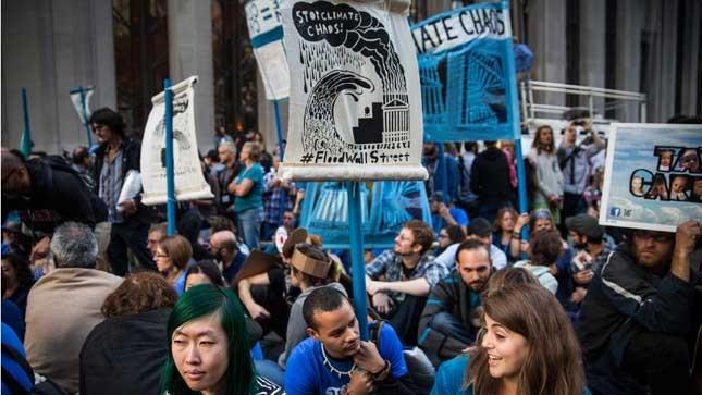 وجاء الاحتجاج الذي سمي "اكتسحوا وول ستريت" في أعقاب يوم تحرك دولي يوم الأحد اجتذب نحو 310 آلاف شخص في شوارع مدينة نيويورك فيما قال نشطاء أنه أكبر احتجاج على الإطلاق في قضية التغير المناخي.