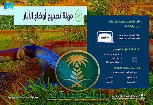 الرياض (واس) دعت وزارة البيئة والمياه والزراعة أصحاب الآبار غير المرخصة إلى الاستفادة من مهلة الإعفاء من الغرامة، وذلك بالإفصاح عن آبارهم غير المرخصة ضمن المهلة المحددة التي تنتهي في 11 صفر 1444هـ.
