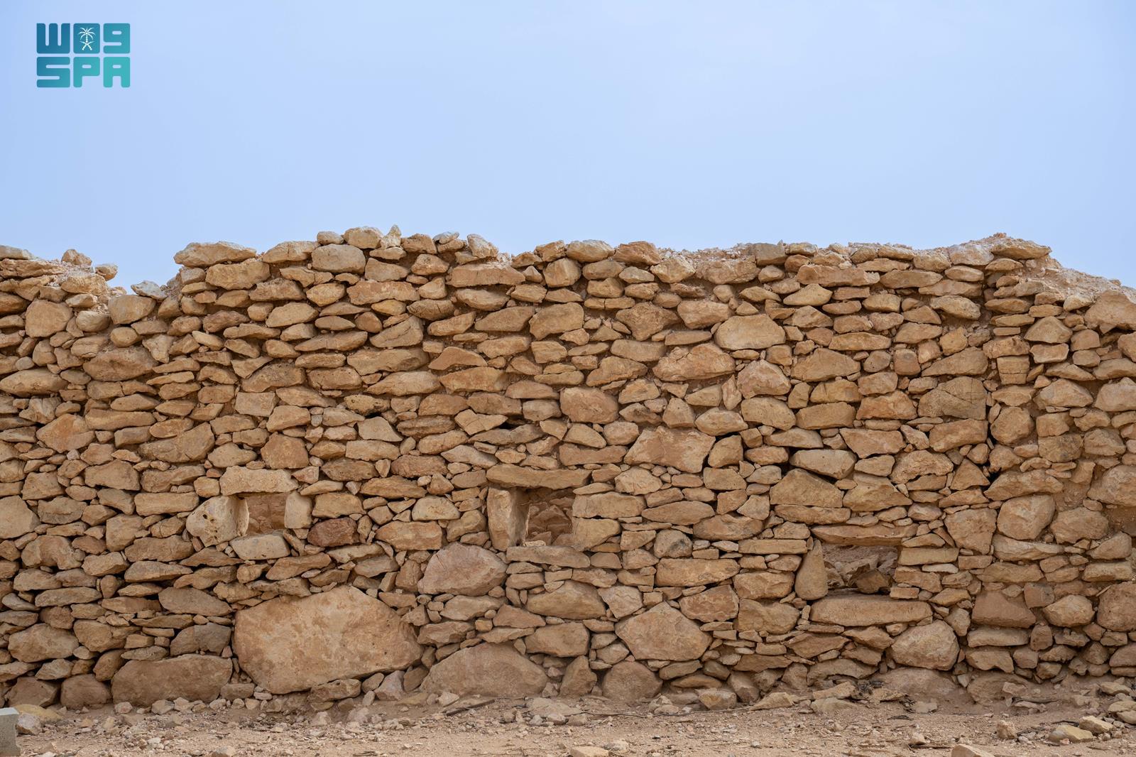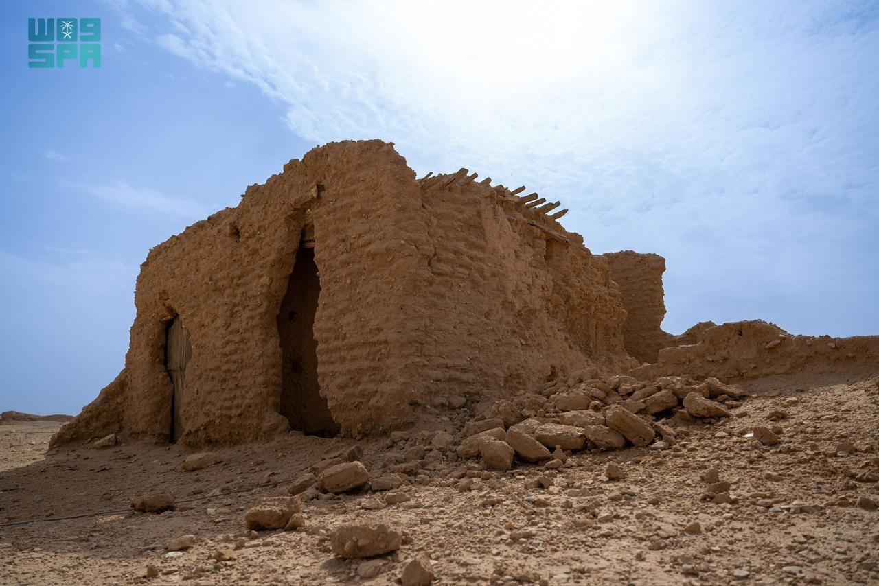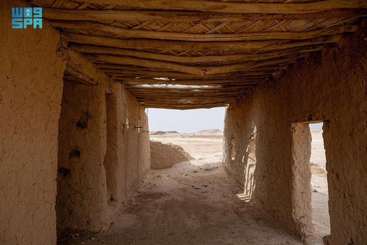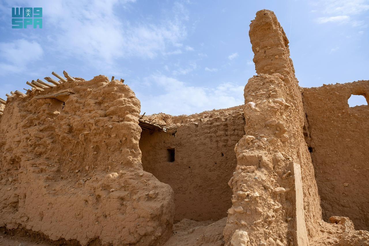 وتحتضن القرية أطلال بيوت طينية وقصورًا أثرية يتجاوز عمر بعضها مئة عام، لا تزال بقاياها قائمة حتى اليوم شاهدةً على حقب تاريخية متتابعة، وعلى أنماط معيشية ارتبطت بالمكان بوصفه محطة استقرار ومورد ماء رئيسًا في بيئة صحراوية.