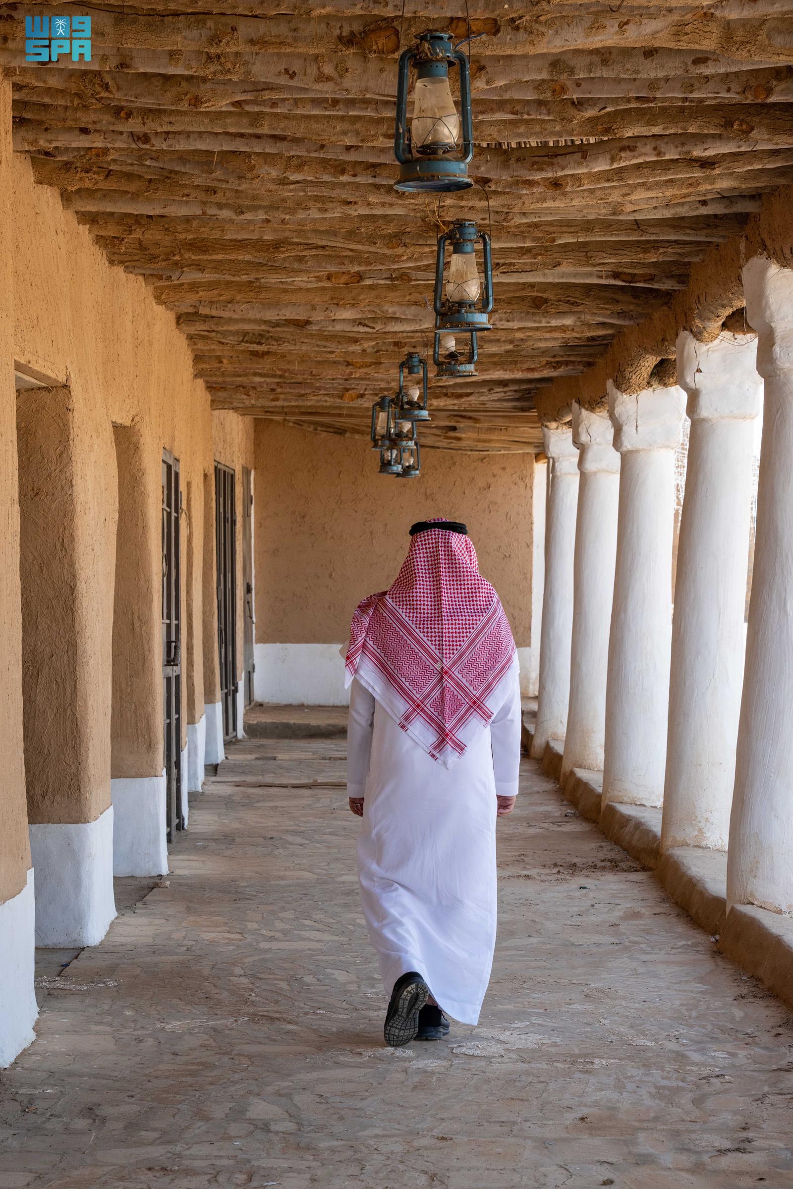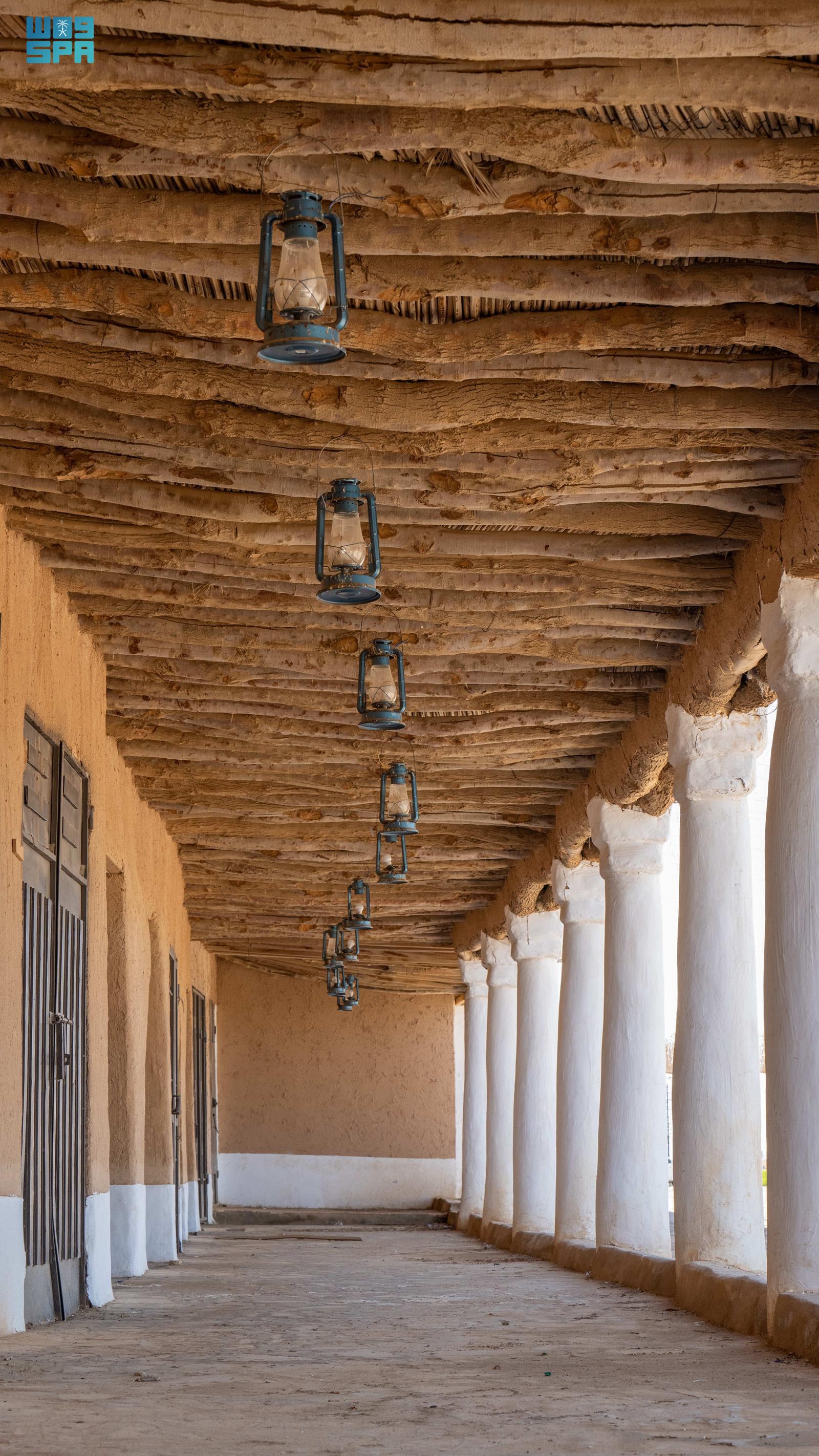 وتبرز في تفاصيلها الممرات الطولية المسقوفة بجذوع الأشجار وسعف النخيل، والمحمولة على أعمدة طينية مطلية بالجص الأبيض، في تصميمٍ يجمع بين البساطة والدقة، ويؤدي وظائف بيئية فاعلة من حيث التهوية وتلطيف درجات الحرارة، فيما تعكس الفوانيس المعلّقة على امتداد السقوف جانبًا من وسائل الإضاءة التقليدية التي كانت جزءًا من الحياة اليومية.