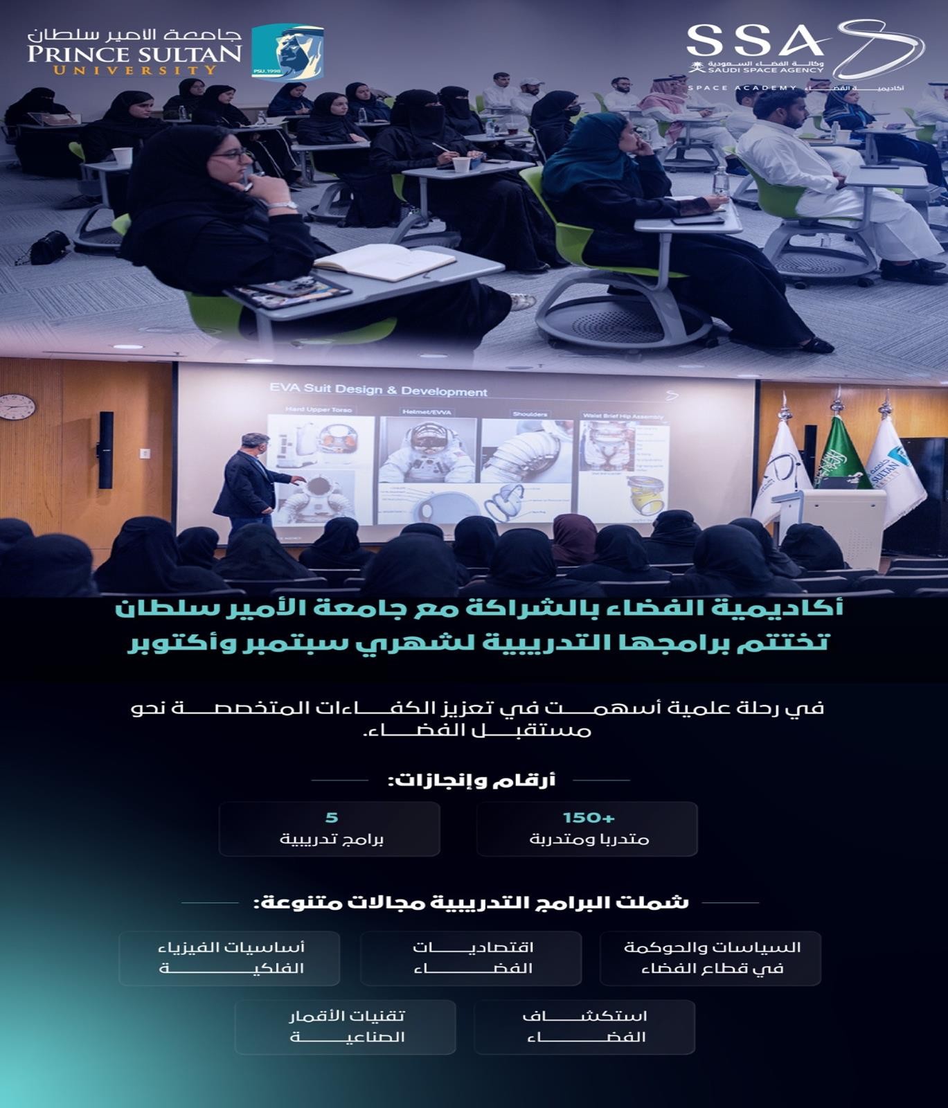 الرياض (واس) اختتمت أكاديمية الفضاء التابعة لوكالة الفضاء السعودية برامجها التدريبية الاحترافية التي استضافتها جامعة الأمير سلطان في الرياض، بمشاركة أكثر من 150 متدربًا ومتدربة.