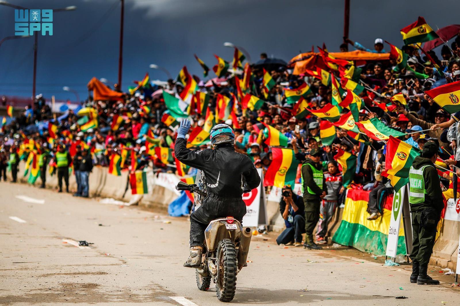 ونجح التشيلي إغناسيو كورنيخو درّاج فريق "مونستر إنرجي هوندا" في خطف المرتبة الأولى في فئة الدراجات النارية، يليه الأرجنتيني لوسيانيو ينافيديس درّاج فريق "هوسكفارنا"، بفارق 3 دقائق و12 ثانية، ليأتي خلفهما الأرجنتيني كيفين ينافيديس درّاج فريق "ريد بل كيه تي إم"، بفارق 3 دقائق و32 ثانية؛ إثر تعرضه لعقوبةٍ زمنية قدرها 3 دقائق، أبعدته عن المرتبة الثانية.