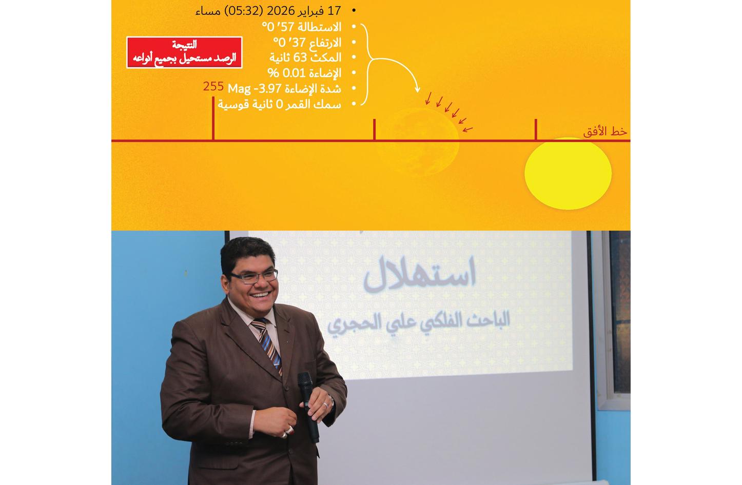 ونوه الحجري بأن هلال شهر رمضان المبارك سيظهر علنا في مساء يوم الأربعاء 18 فبراير الجاري وهو على ارتفاع 11° و44’ وبفترة مكث لـساعة وباستطالة 12° و39’ للحسابات السطحية بشرط صفاء الجو.