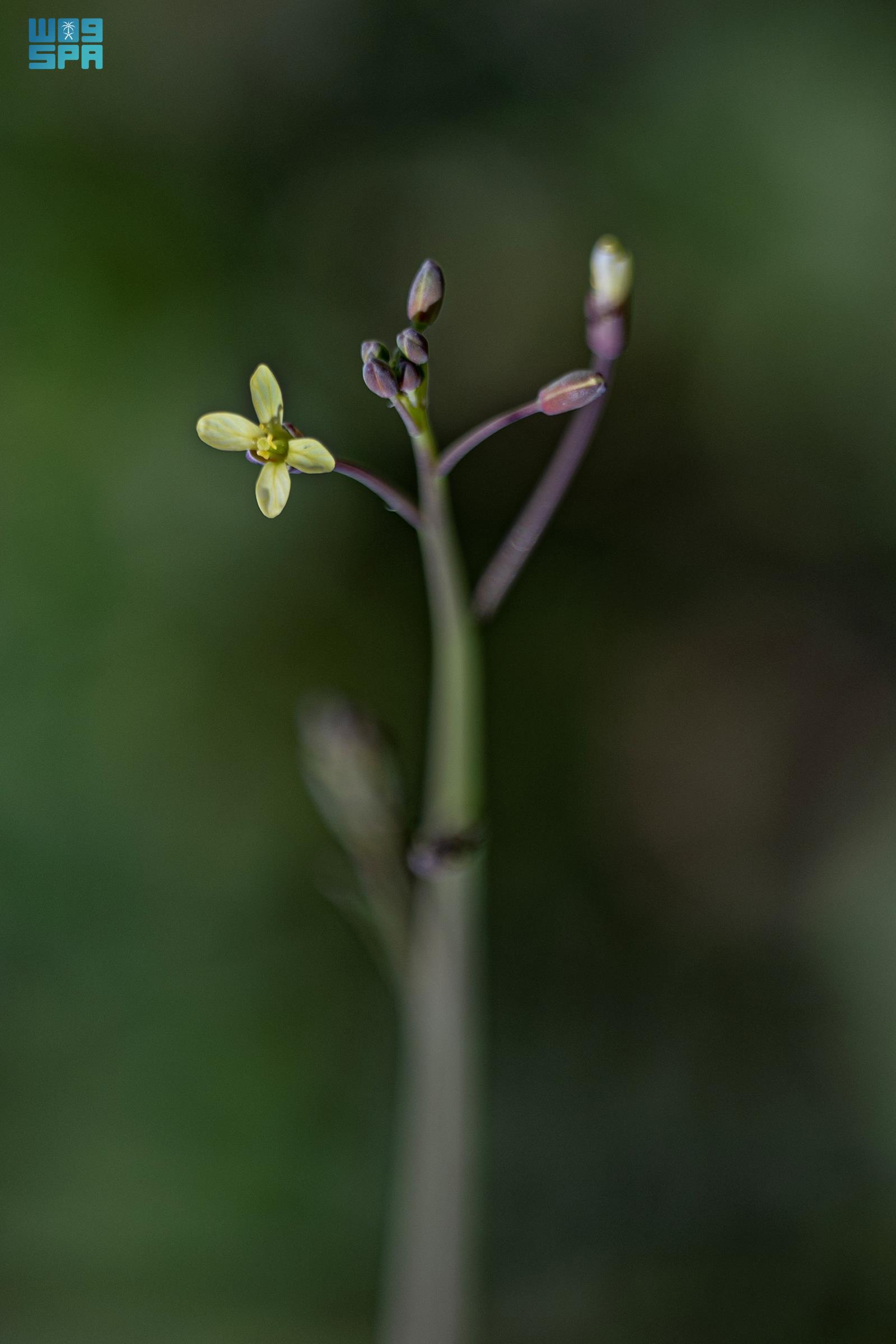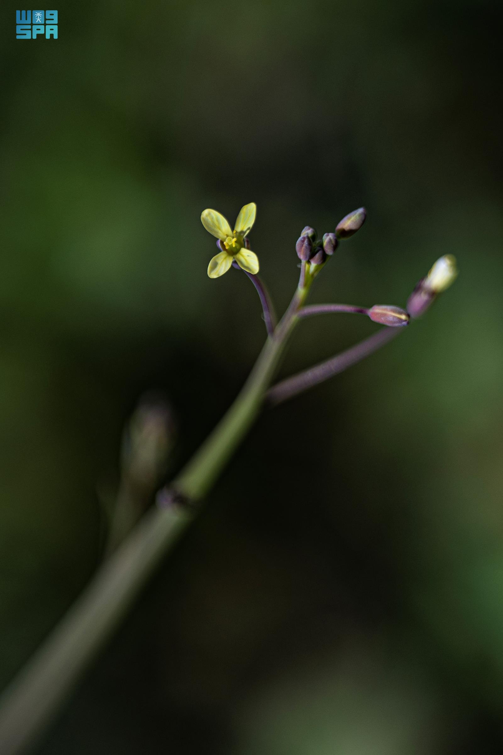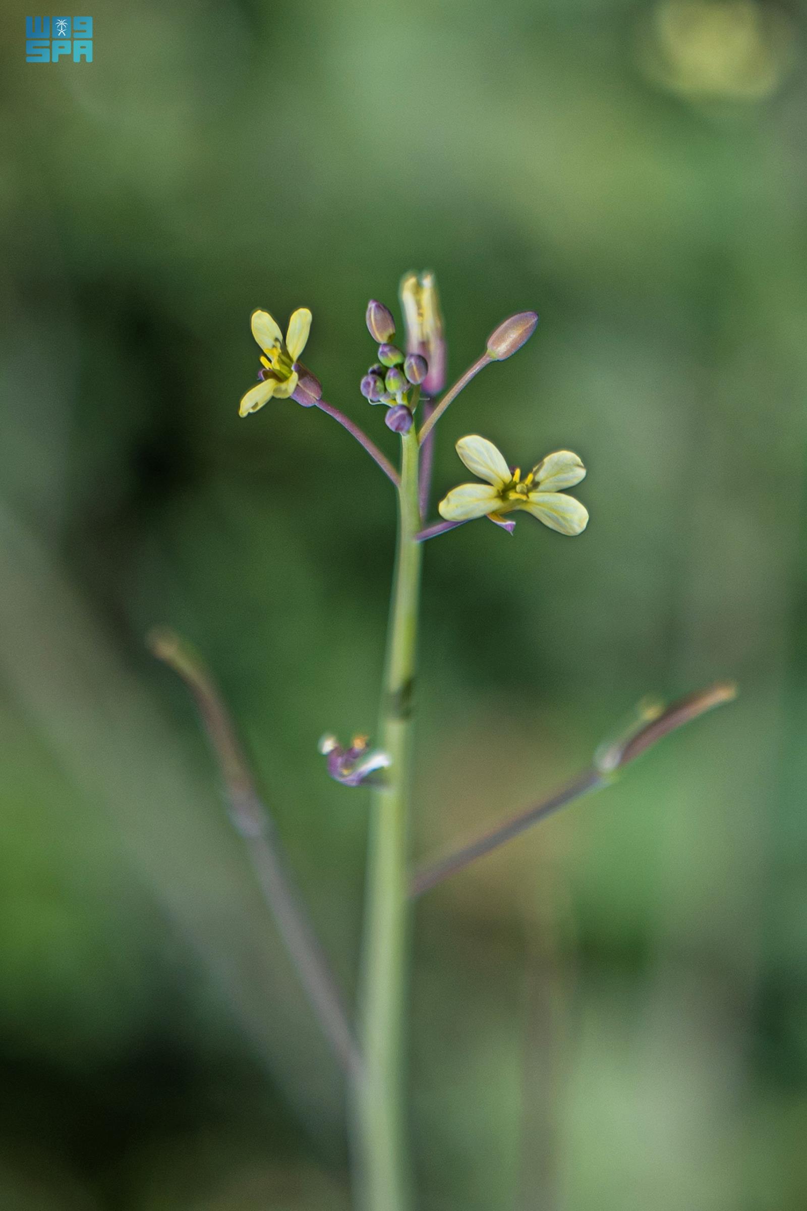 وفي نهايات الفروع تتفتح أزهار صفراء صغيرة يتراوح قطرها 3 وبين 4 ملم، وتتكوّن من أربع بتلات متعامدة، وهي سمة نباتية تميّز أفراد الفصيلة المتعامدة. ومع اكتمال دورة الإزهار تتكوّن قرون صغيرة تحتوي على بذور النبات، التي تسهم في تكاثره وانتشاره في التربة عند توافر الظروف المناخية الملائمة.