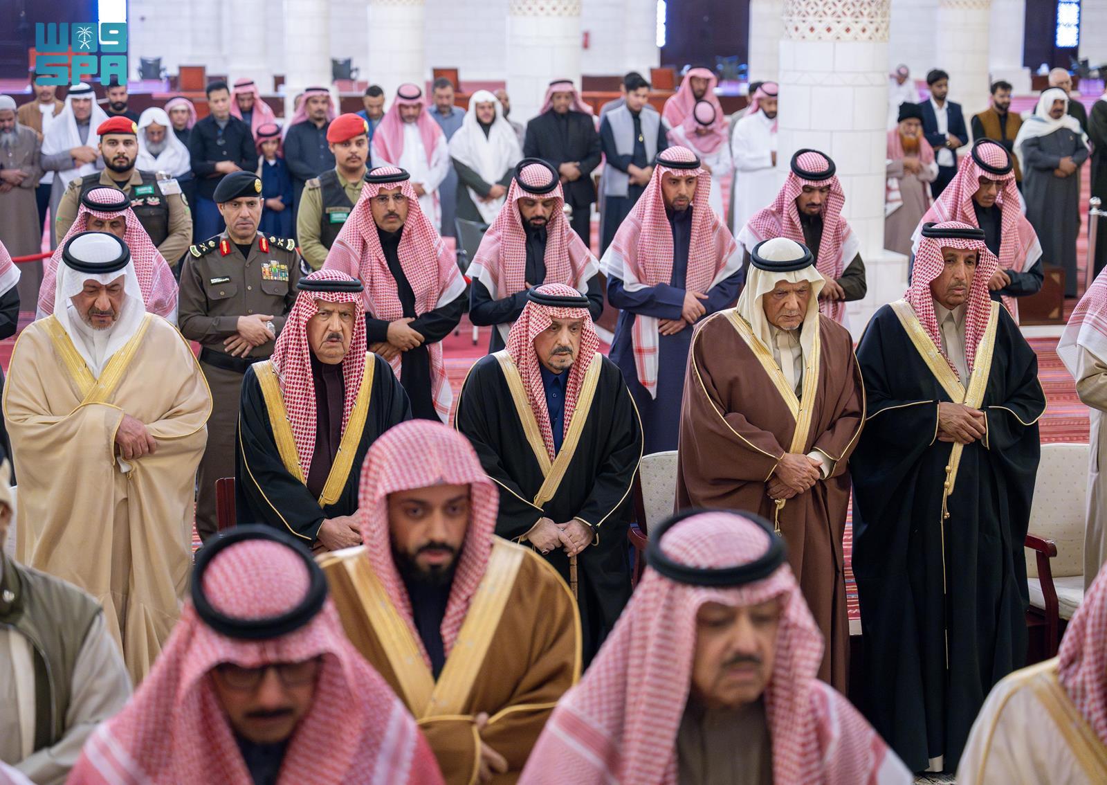 وأدى الصلاة مع سموه، صاحب السمو الملكي الأمير تركي بن فيصل بن عبد العزيز، وصاحب السمو الأمير متعب بن ثنيان بن محمد، وصاحب السمو الملكي الأمير سطام بن سعود بن عبد العزيز، وصاحب السمو الملكي الأمير د. مشعل بن محمد بن سعود بن عبد العزيز، وصاحب السمو الأمير سعود بن عبد الله بن ثنيان بن محمد، وصاحب السمو الأمير عبد الرحمن بن فهد بن فيصل بن فرحان، وصاحب السمو الملكي الأمير معتصم بن سعود بن عبد العزيز، وصاحب السمو الملكي الأمير مصعب بن سعود بن عبد العزيز، وصاحب السمو الملكي الأمير حسام بن سعود بن عبد العزيز أمير منطقة الباحة، وصاحب السمو الأمير محمد بن سعد بن خالد بن محمد، وصاحب السمو الملكي الأمير مشعل بن بدر بن سعود بن عبد العزيز، وصاحب السمو الملكي الأمير الوليد بن بدر بن سعود بن عبد العزيز، وصاحب السمو الأمير بندر بن سعد بن خالد بن محمد، وصاحب السمو الملكي الأمير عبد العزيز بن بدر بن سعود بن عبد العزيز، وصاحب السمو الملكي الأمير نهار بن عبد الله بن سعود بن عبد العزيز، وصاحب السمو الأمير مشعل بن متعب بن ثنيان بن محمد.