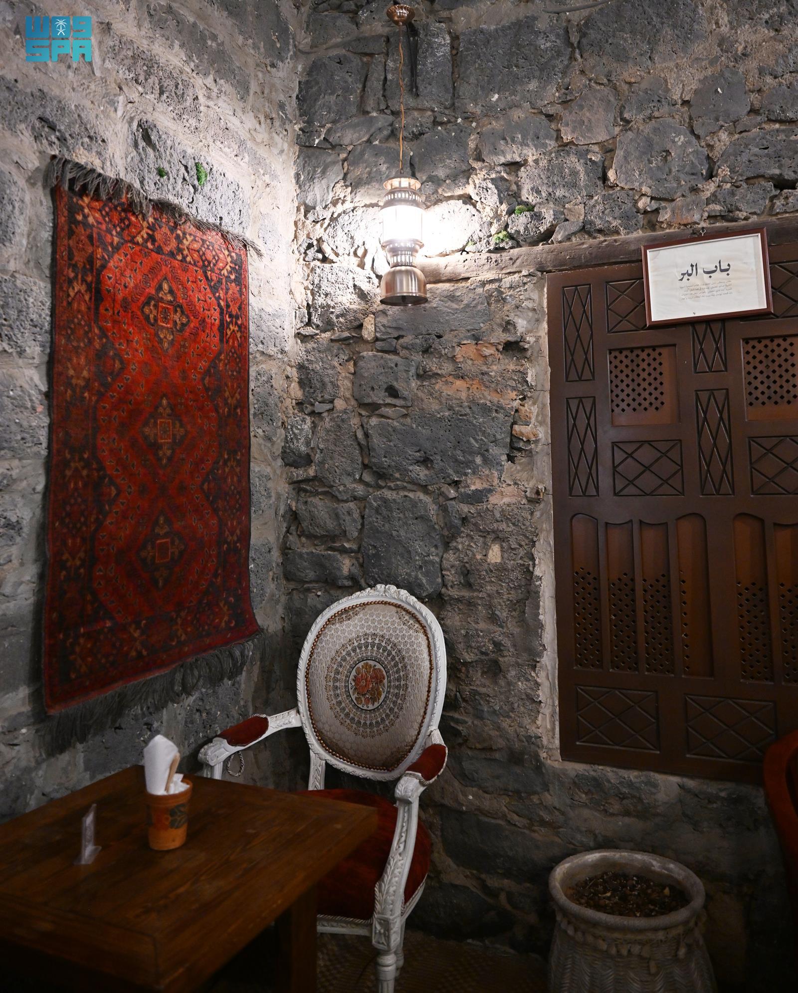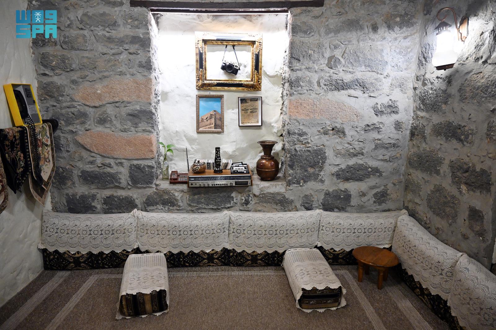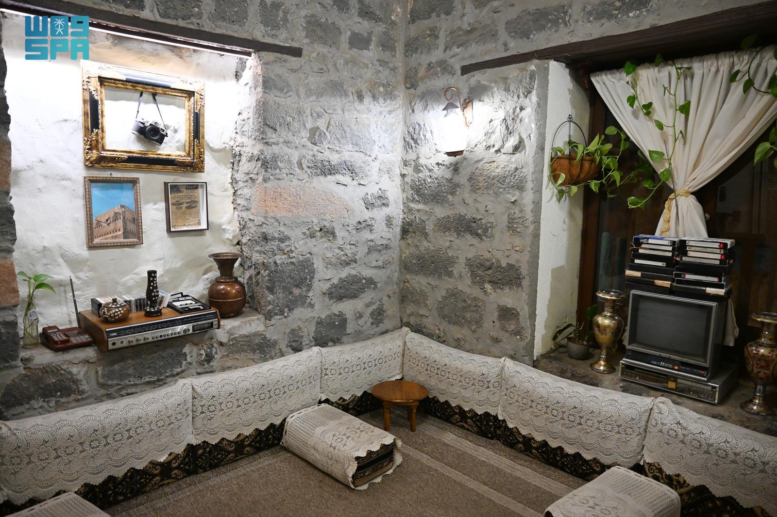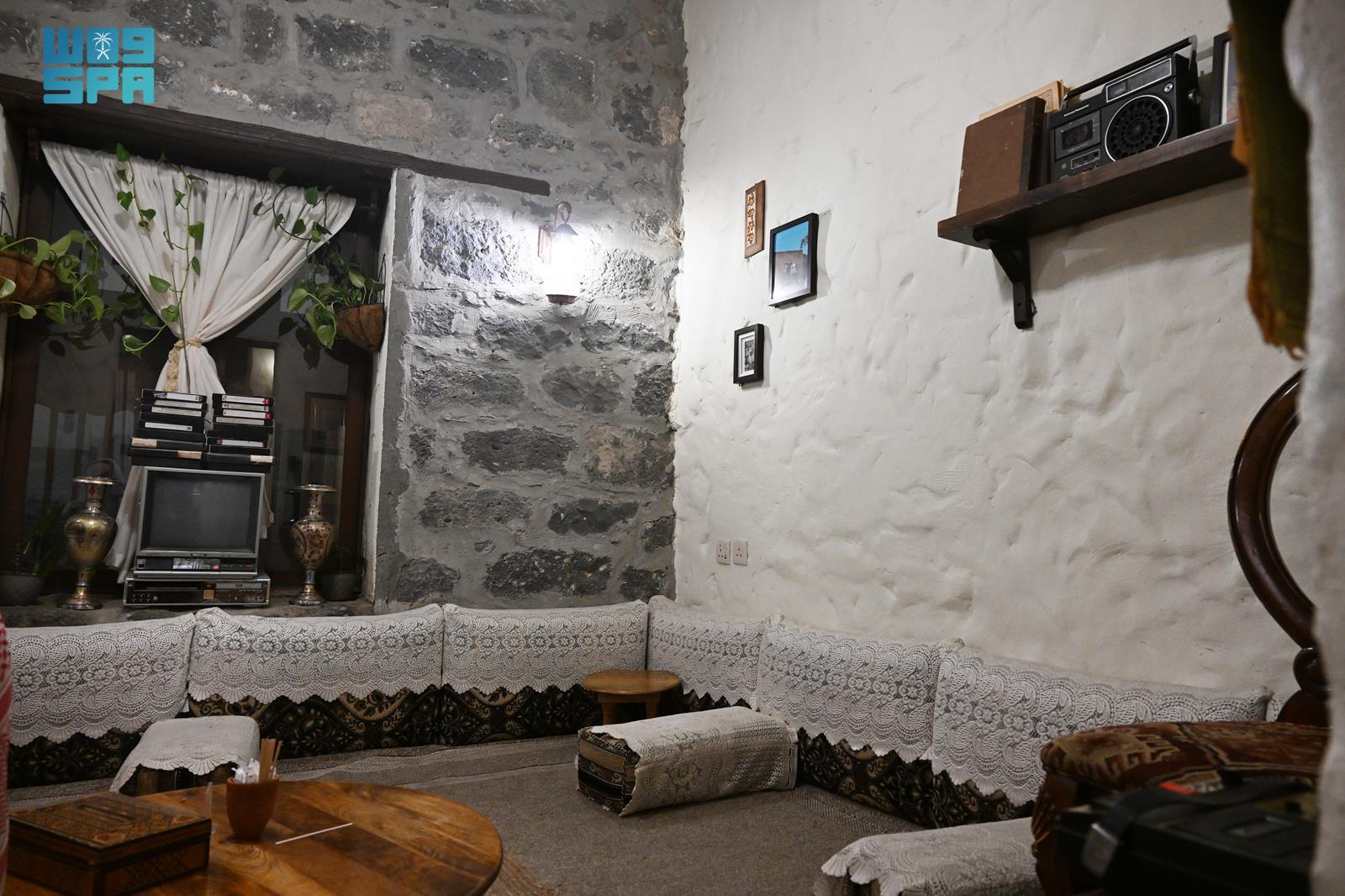 ويتميز البيت المديني بطابع تراثي أصيل، يتجلى في مجلس الرجال بعناصره وتفاصيله؛ حيث تُفترش الأرض بمراتب محشوة بالقطن، تعلوها أغطية بيضاء مزدانة بزخارف نباتية نسجتها أيادي الماضي، وتتناغم مع المساند القطنية المزخرفة، فيما تعلو الجدران رفوف خشبية عُرضت عليها التحف وأدوات الزينة التي شكّلت جزءًا من هوية المجالس المدينية عبر الأزمنة.