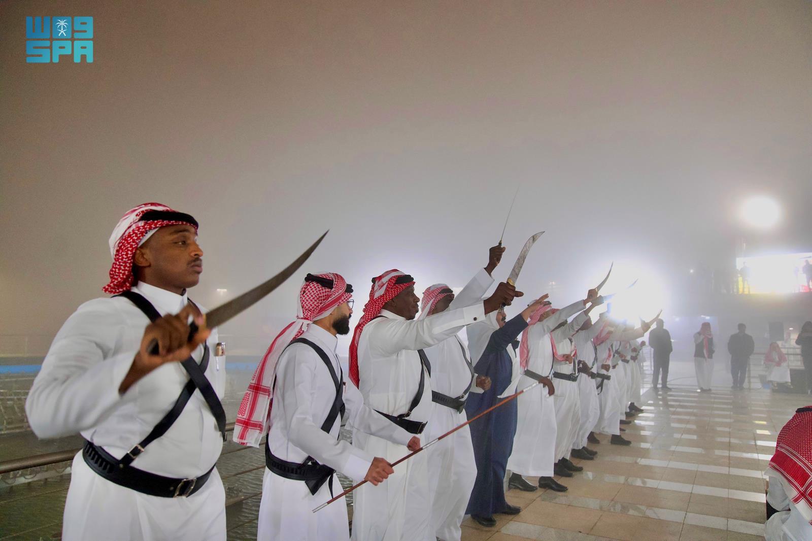وقدّم المشاركون لوحات أدائية متقنة، اصطفوا خلالها في صفوف متقابلة، حاملين الجنابي، على إيقاع الطبول والأهازيج الجماعية، في مشهد يعكس الانسجام والدقة في الأداء، ويبرز مهارة العرّاضة في التنقلات الحركية والإيقاعية.